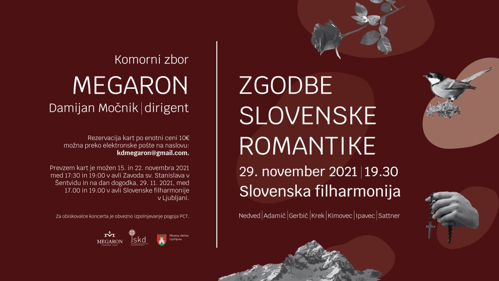 Prisrčno vabljeni na koncert KZ Megaron z naslovom Zgodbe slovenske romantike, ki bo v ponedeljek, 29. novembra 2021, ob 19.30, v Dvorani Marjana Kozine v Slovenski filharmoniji.
